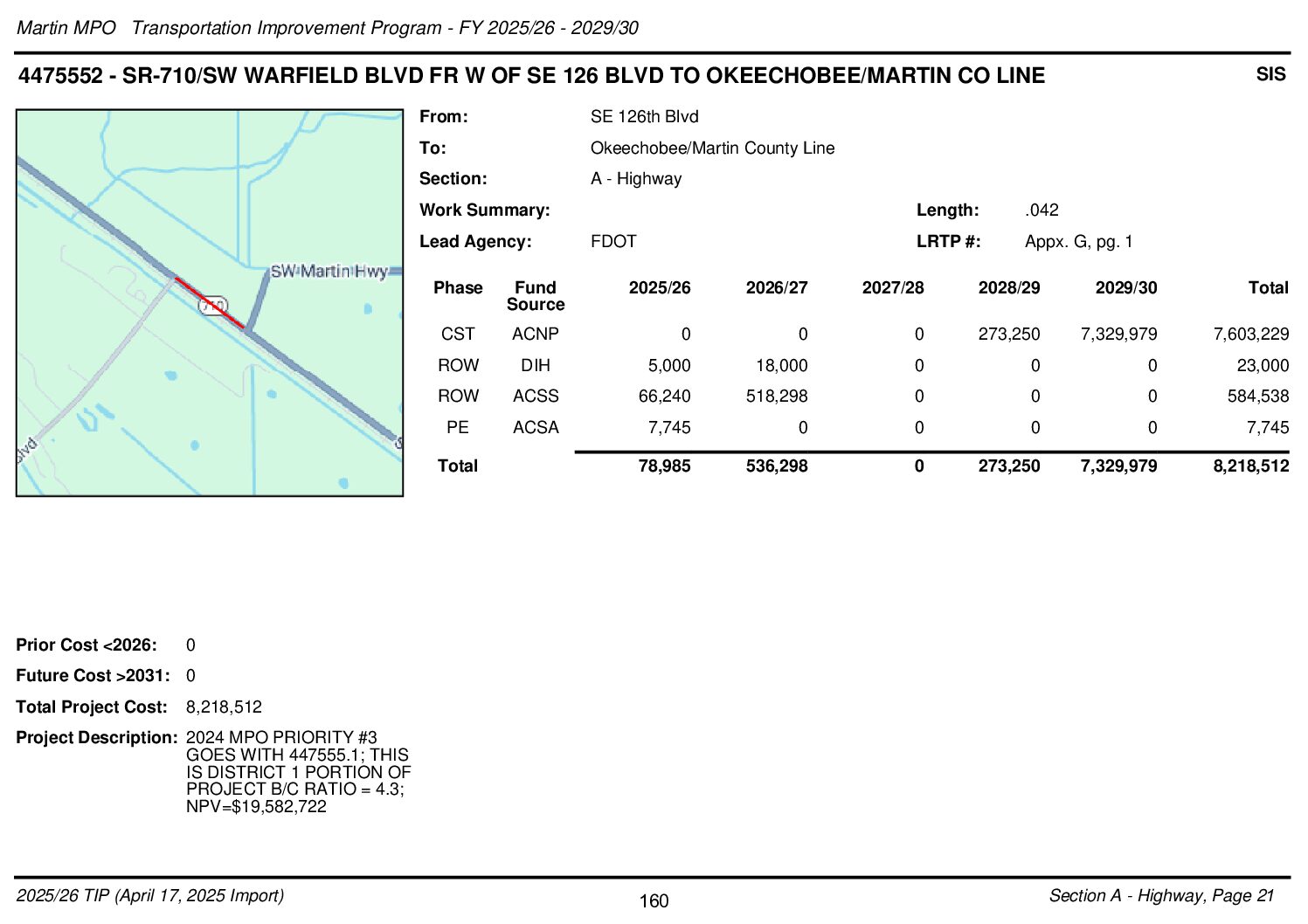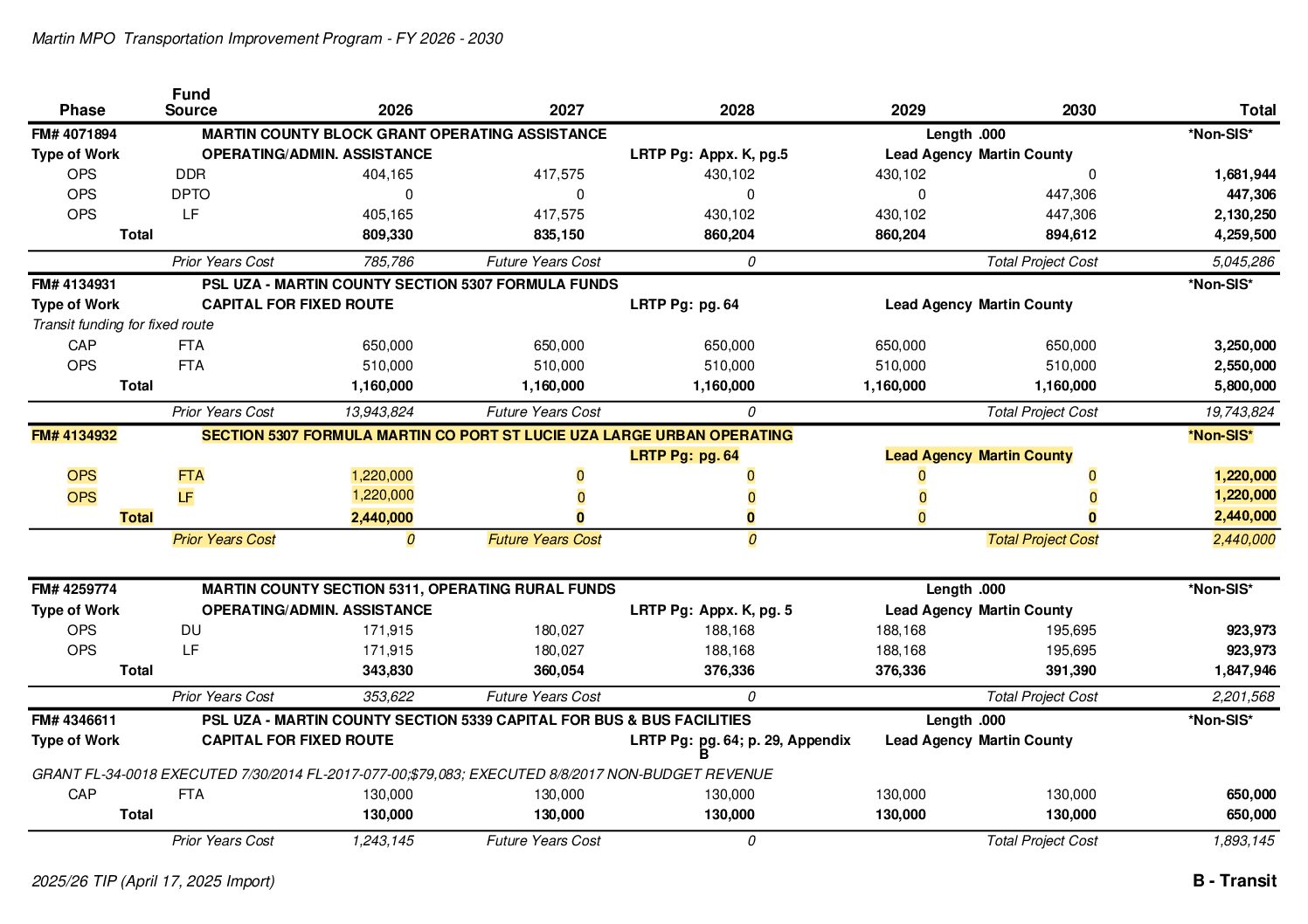 The Florida Department of Transportation (FDOT) has requested the addition of two projects to our Transportation Improvement Program. Those projects include the FM# 447555-2 SR-710/SW Warfield Blvd from W of SE 126 Blvd to Okeechobee/Martin County Line and the FM#413493-2 Section 5307 Formula Martin County Port St. Lucie UZA Large Urban Operating.