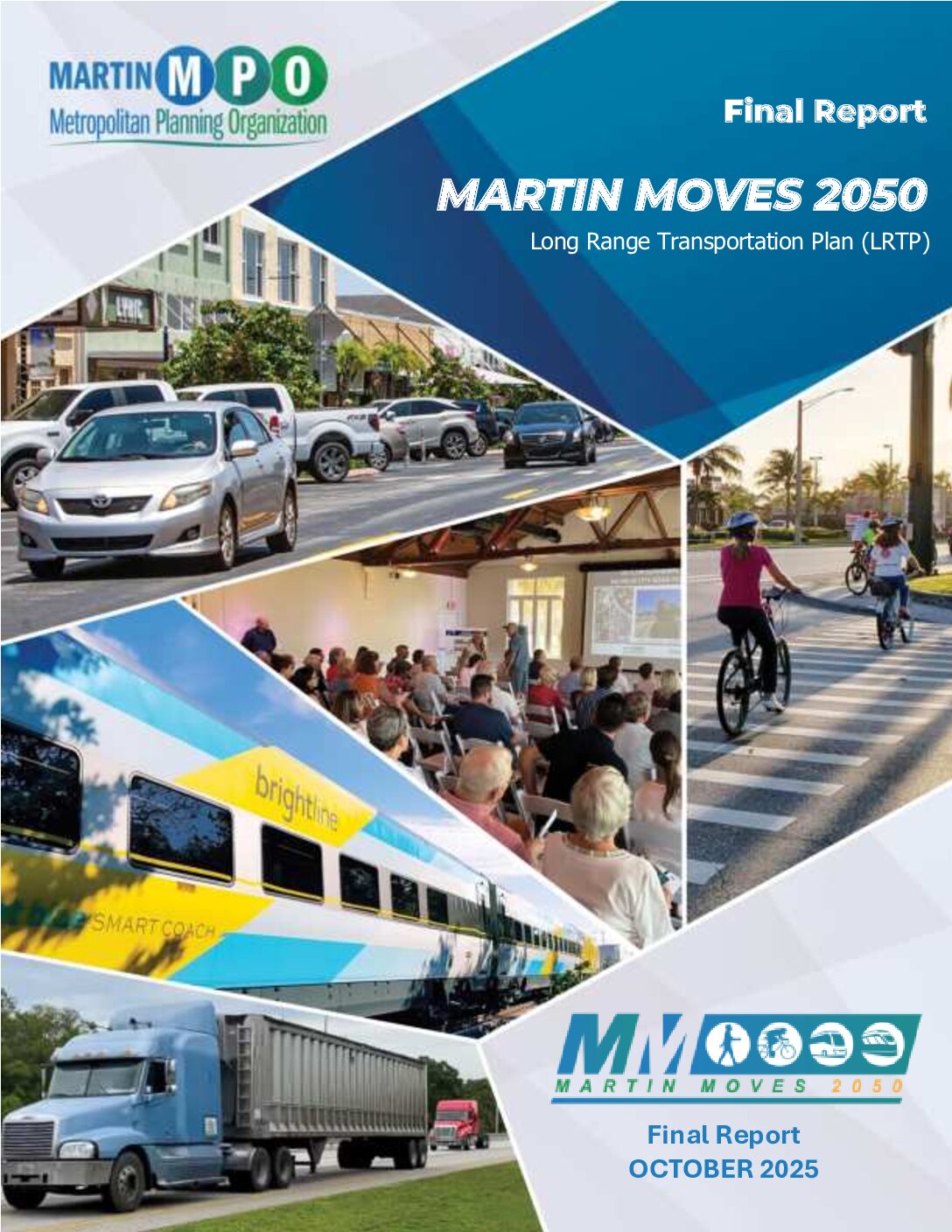 The Long  Range Transportation Plan sets the vision for transportation for all modes of travel throughout the County and influences projects included in the 5-year Transportation Improvement Program (TIP) and the annual List of Project Priorities (LOPP). The Martin MPO’s 2050 LRTP, also known as Martin Moves 2050, includes both long-range and short-range strategies/actions that provide for the development of an integrated multimodal transportation system (including accessible pedestrian walkways and bicycle transportation facilities) to facilitate the safe and efficient movement of people and goods in addressing current and future transportation demand.  The report serves as a living document that is amended as needed.