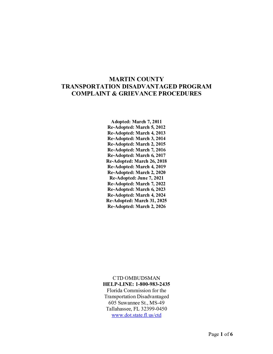 Martin County Transportation Disadvantaged services are governed by a five-year plan called the Transportation Disadvantaged Service Plan (TDSP). This document was adopted by the Martin Local Coordinating Board for Transportation Disadvantaged (LCB-TD) on March 1, 2021.